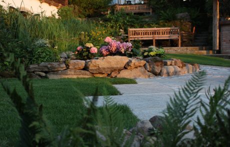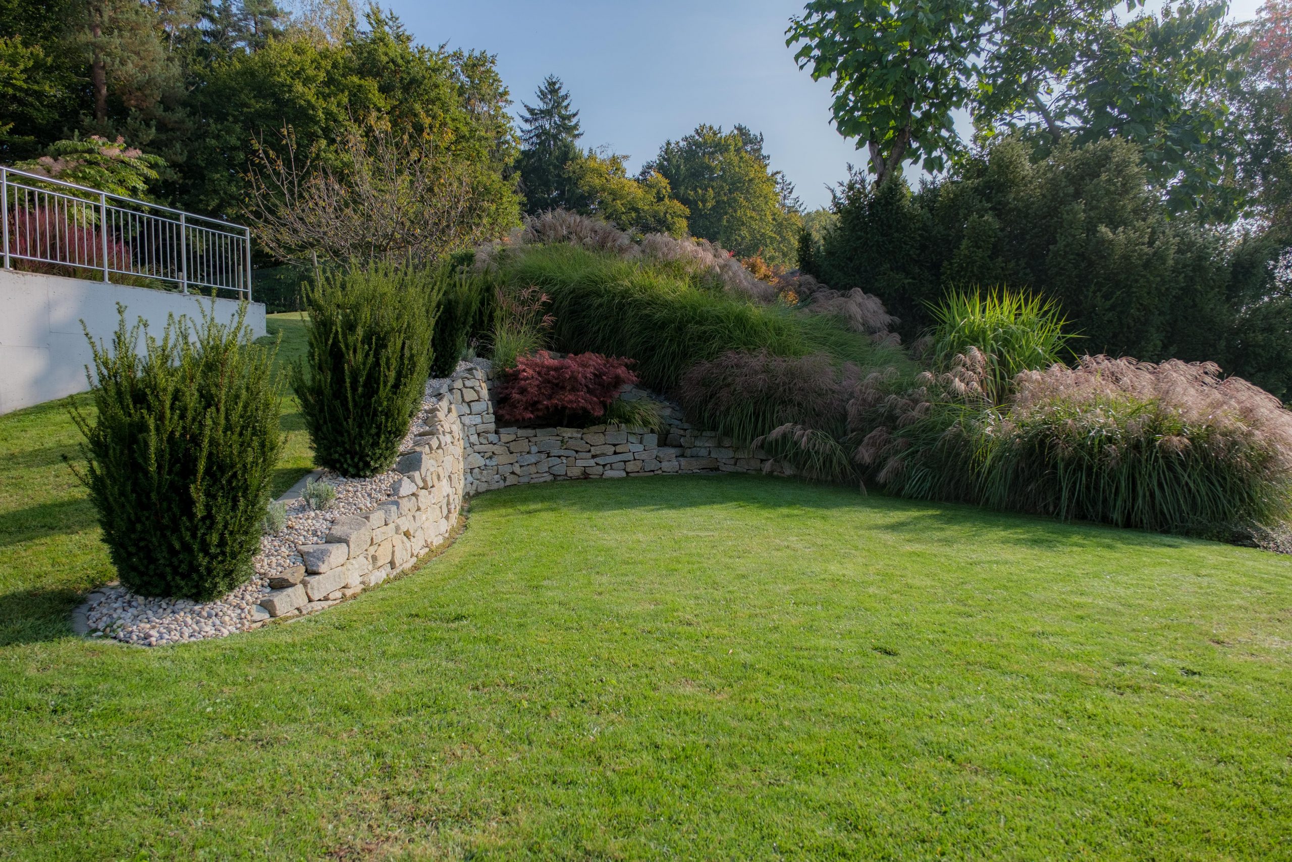 Mit neuen Geländemodellierungen, dem Bau einer Trockensteinmauer, dem Einbau einer automatischen Bewässerung und eines automatischen Mäh-Roboters haben die Kunden jetzt deutlich weniger Arbeit!