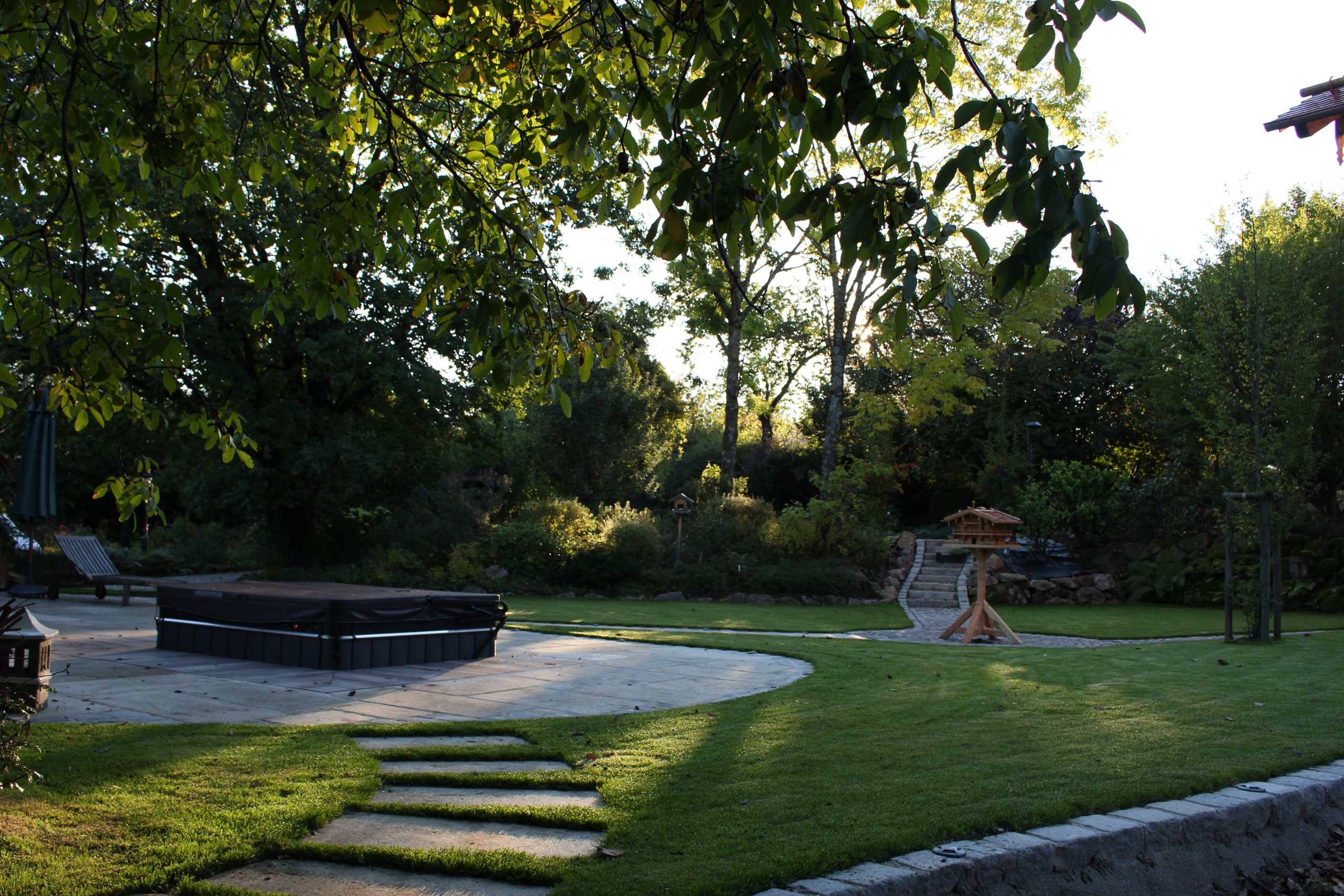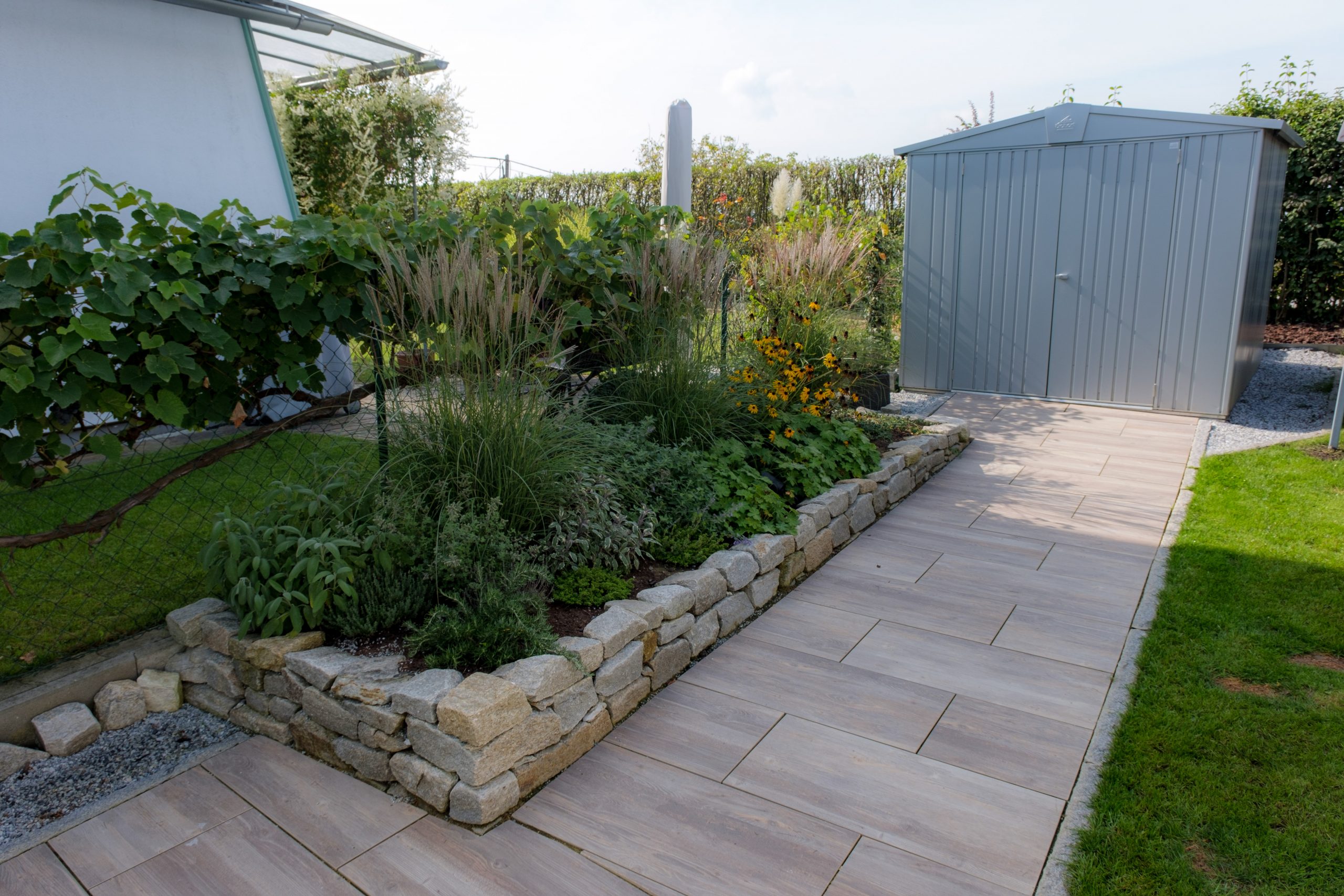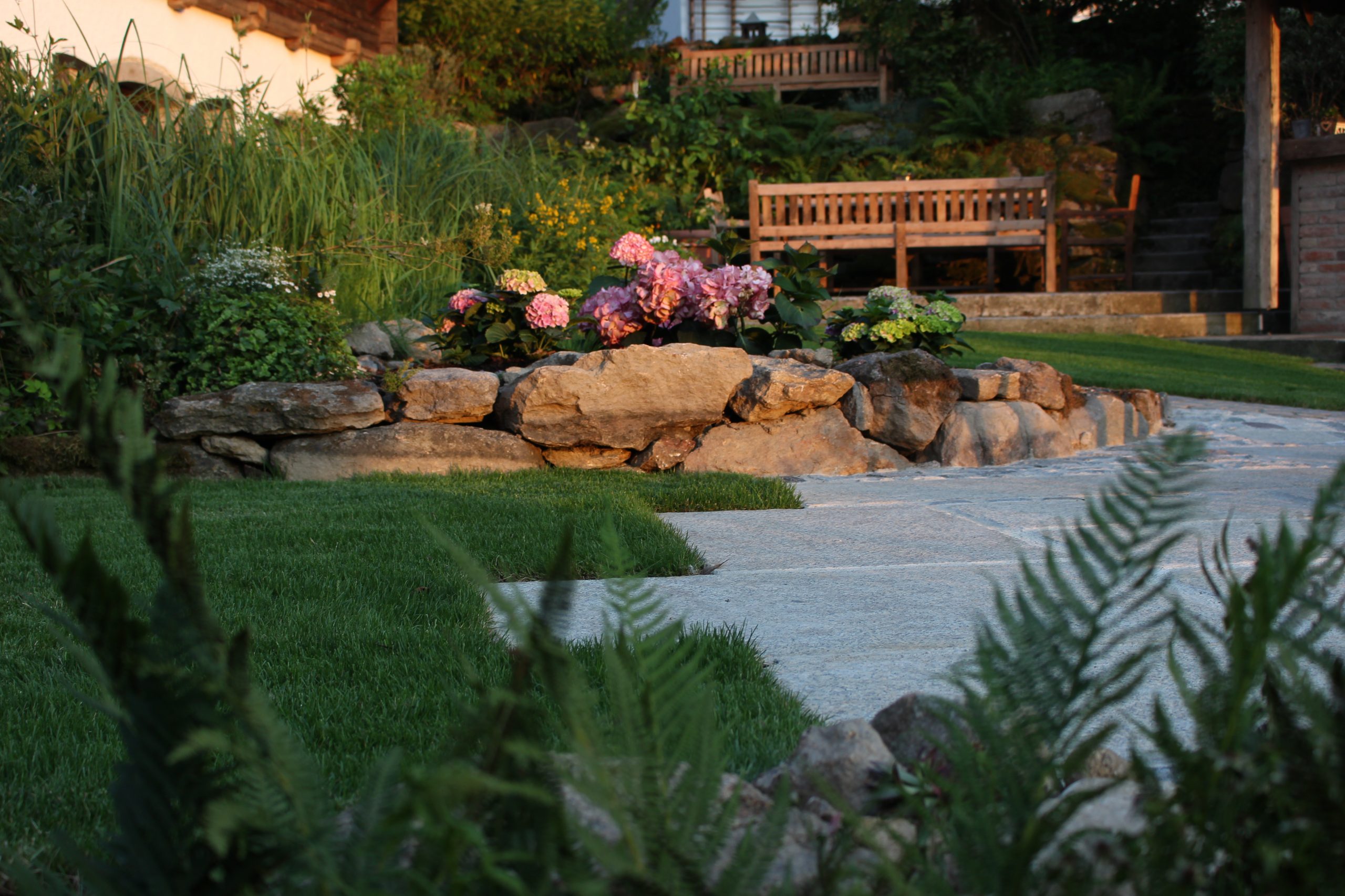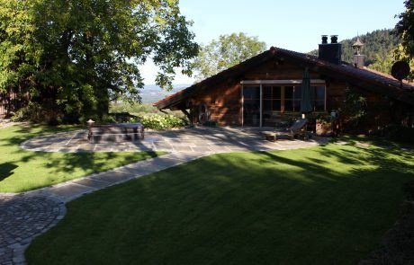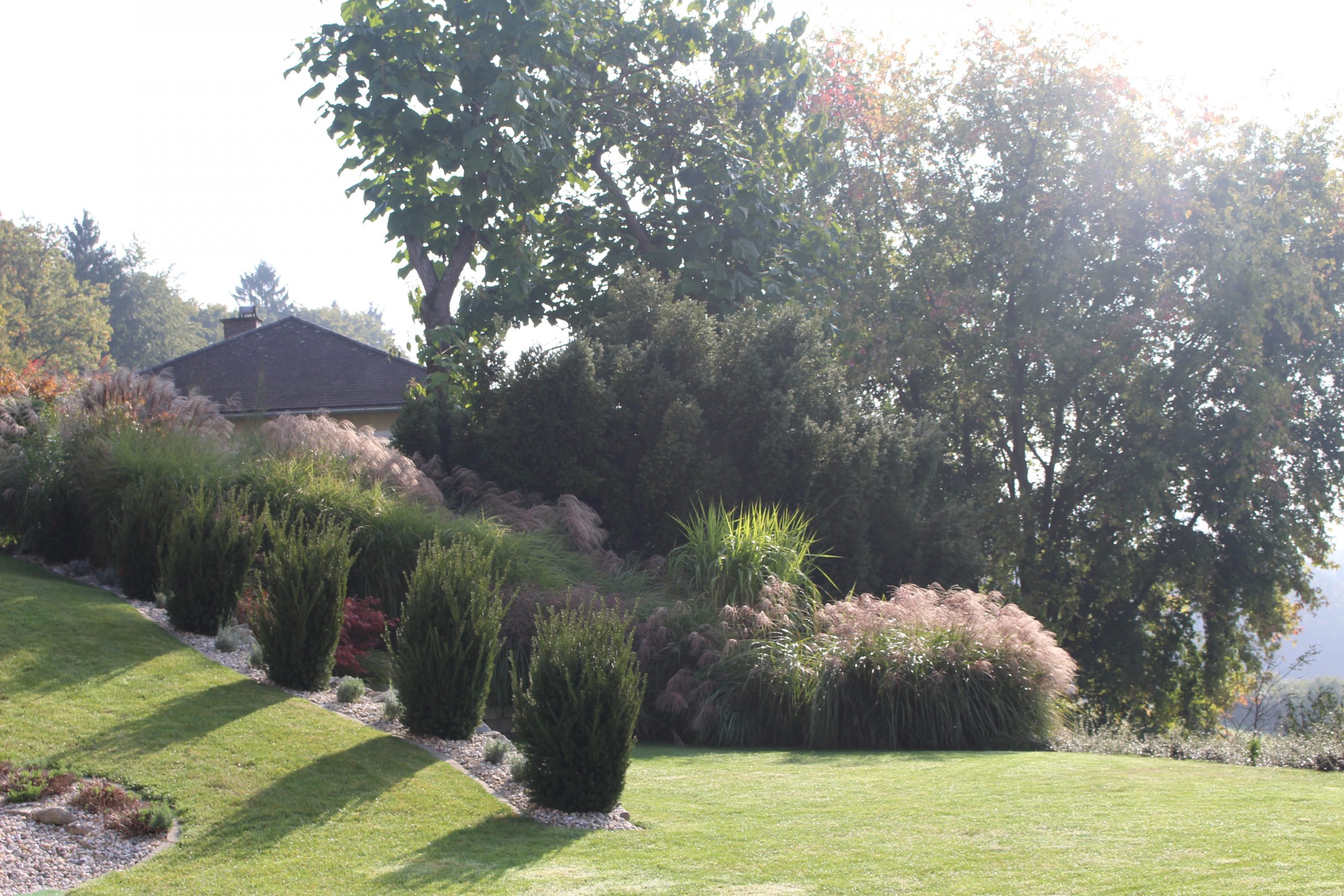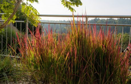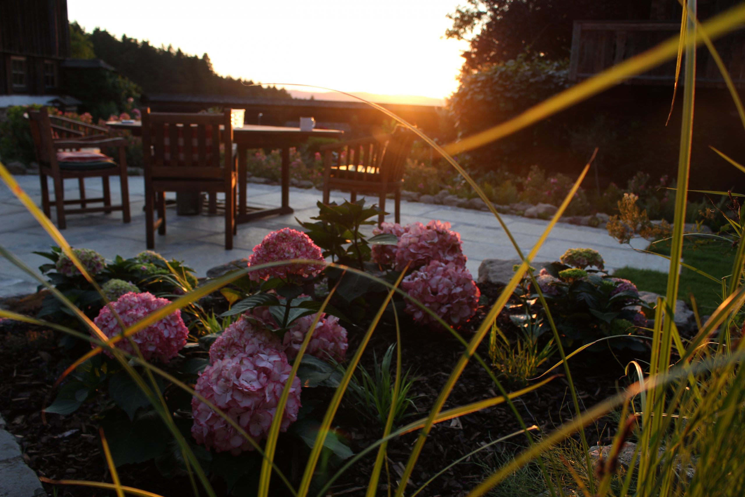 Die Errichtung eines Sitzplatzes an der Westseite des Hauses ermöglicht nun, die schöne Aussicht, welche die Lage bietet, mit einem Gläschen Wein zu genießen. Die Abendsonne wirkt besonders an diesem Platz und sehr viele Gräser (Miscanthus sinensis, Pennisetum alopecoroides, Imperata cylindrica, uvm.) glitzern in ihr.