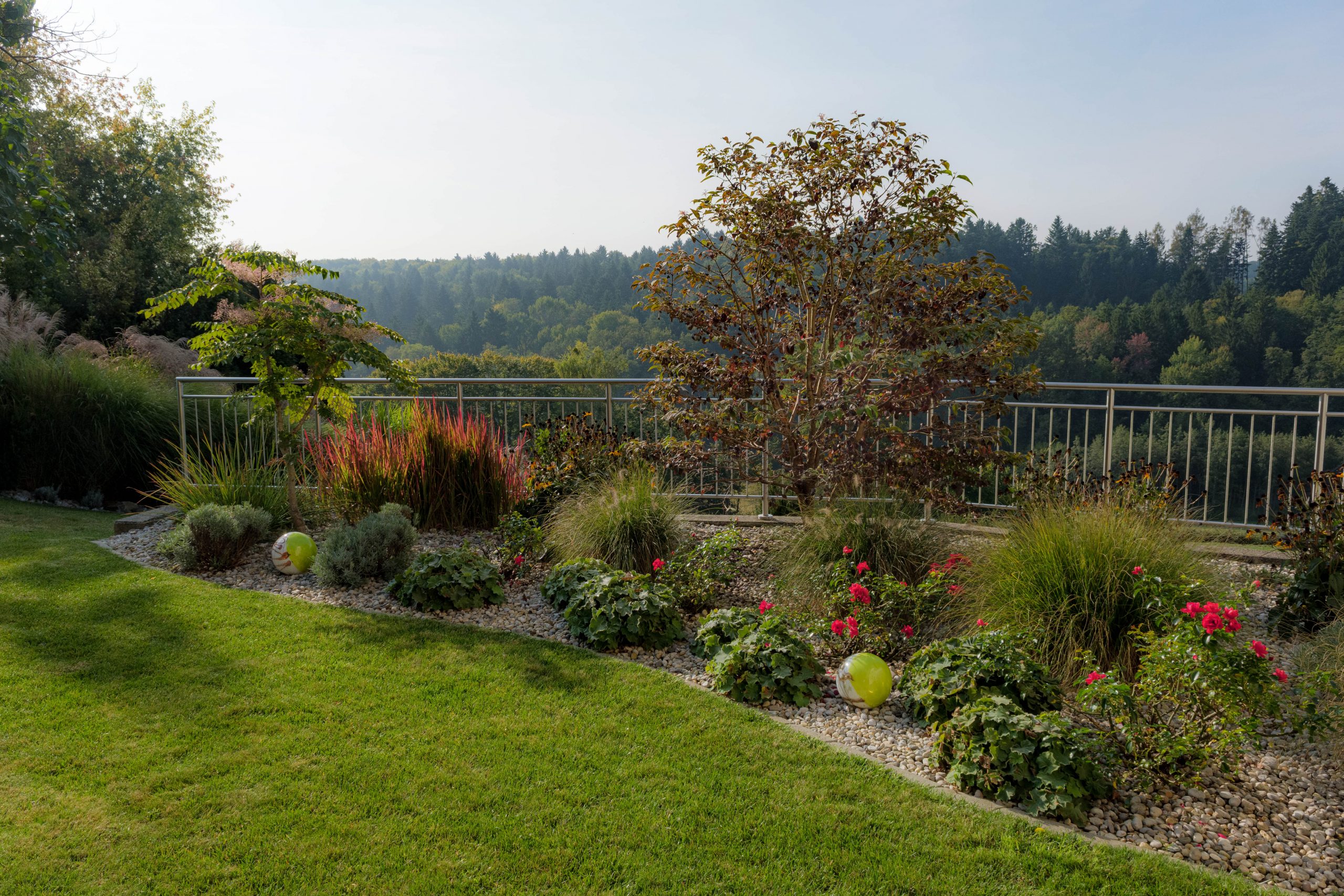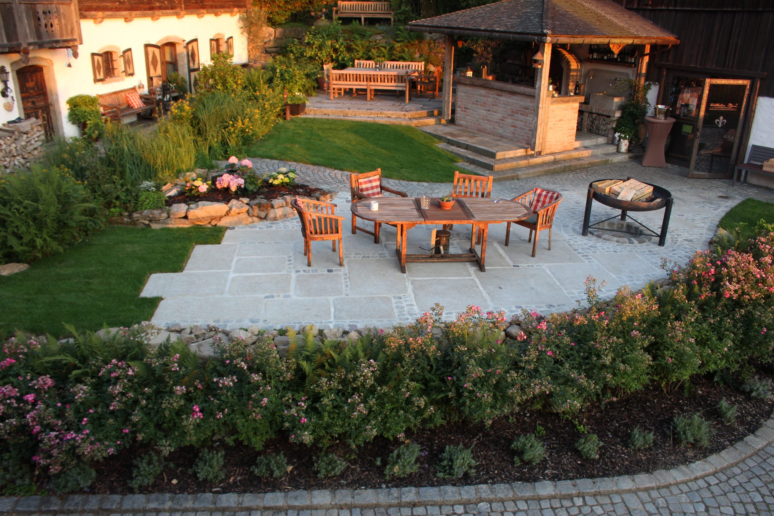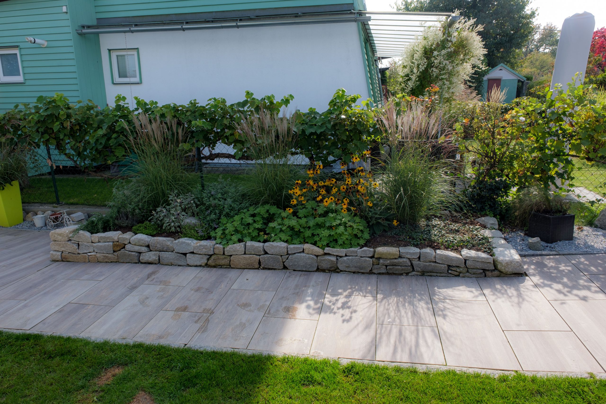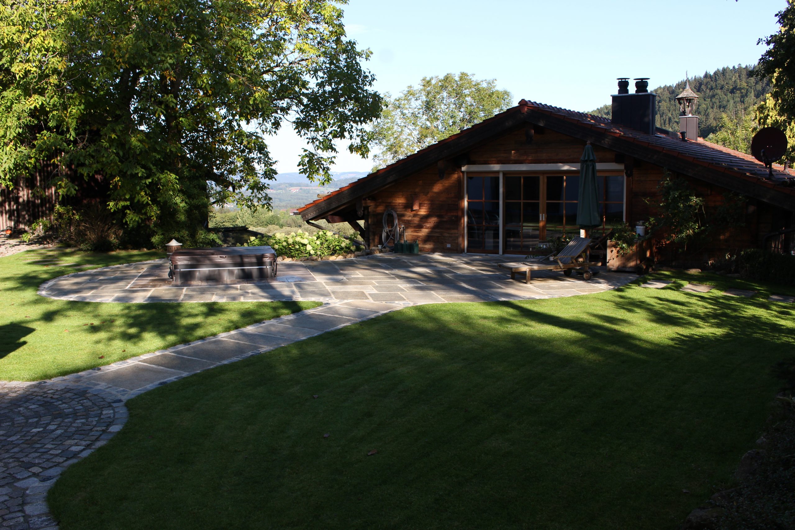 Die Errichtung eines Sitzplatzes an der Westseite des Hauses ermöglicht nun, die schöne Aussicht, welche die Lage bietet, mit einem Gläschen Wein zu genießen. Die Abendsonne wirkt besonders an diesem Platz und sehr viele Gräser (Miscanthus sinensis, Pennisetum alopecoroides, Imperata cylindrica, uvm.) glitzern in ihr.