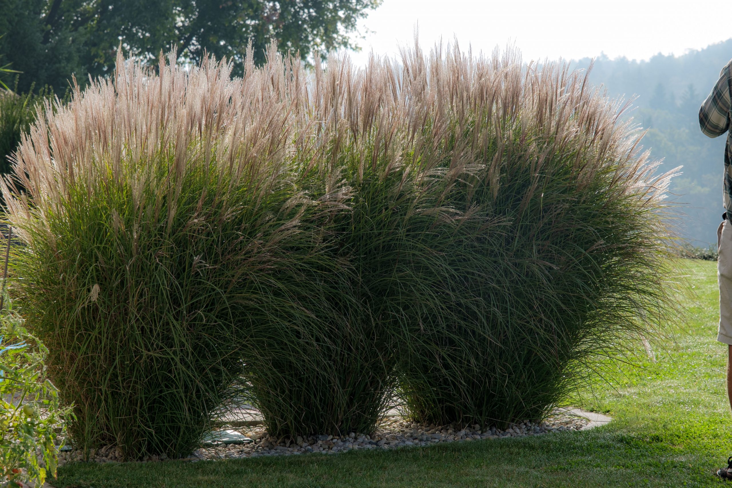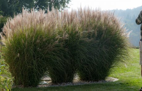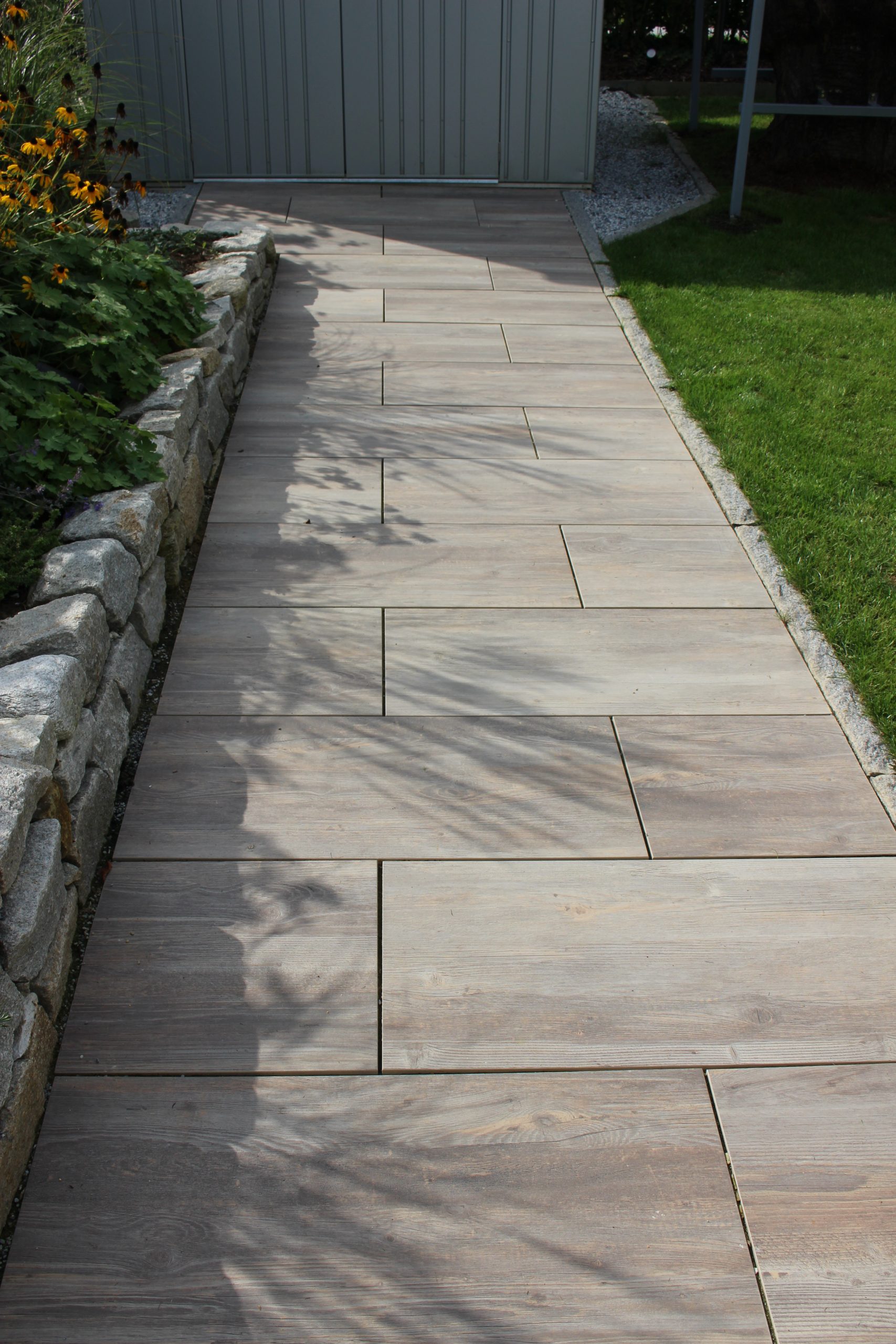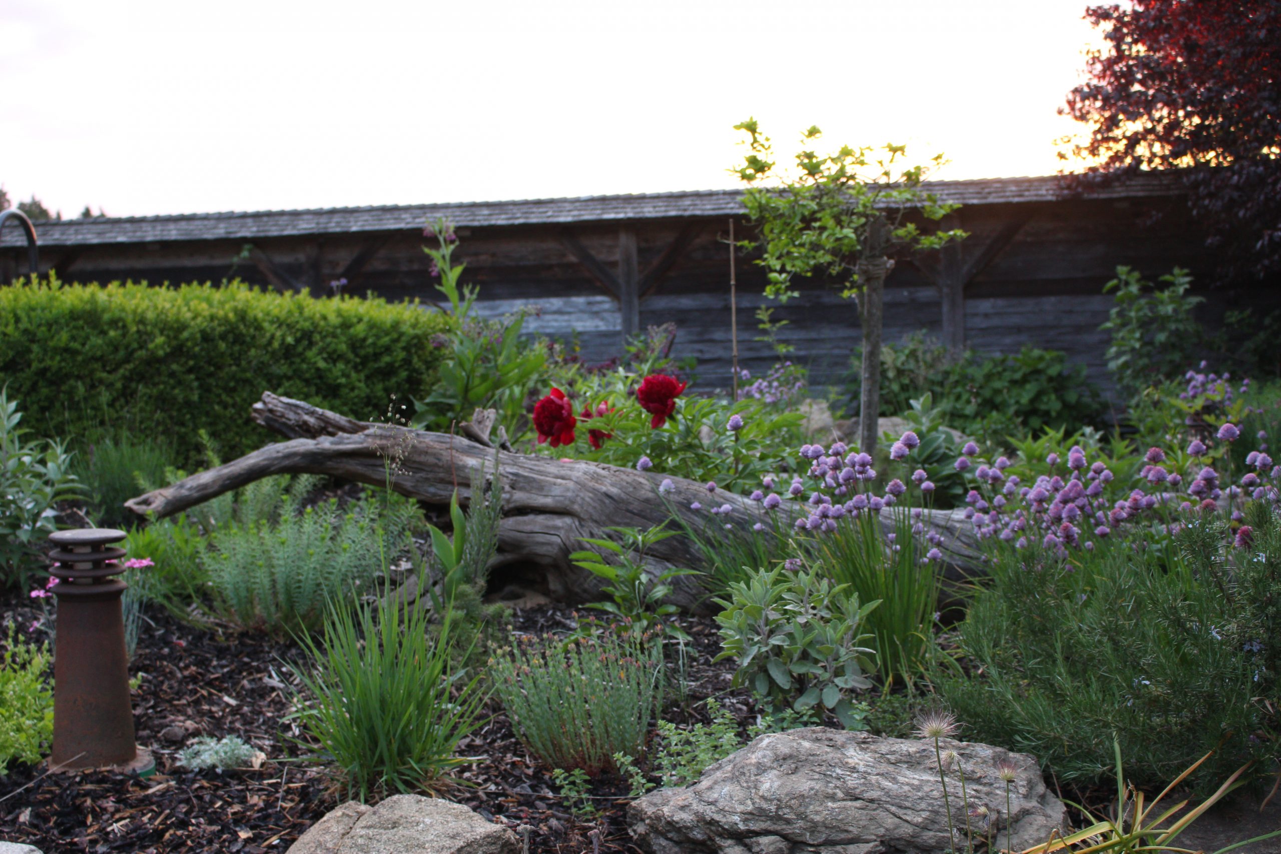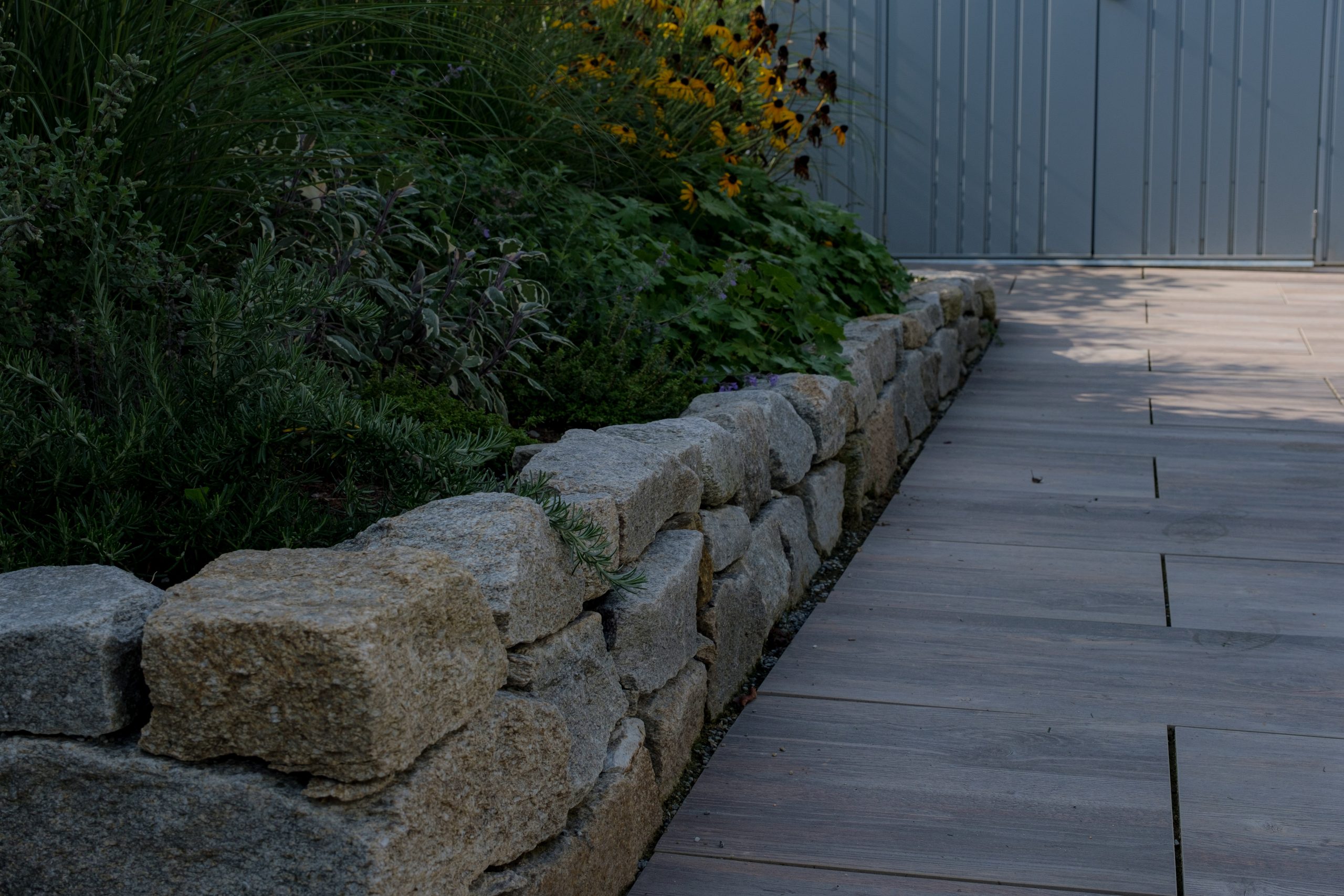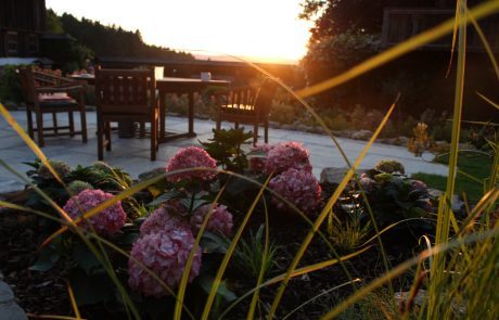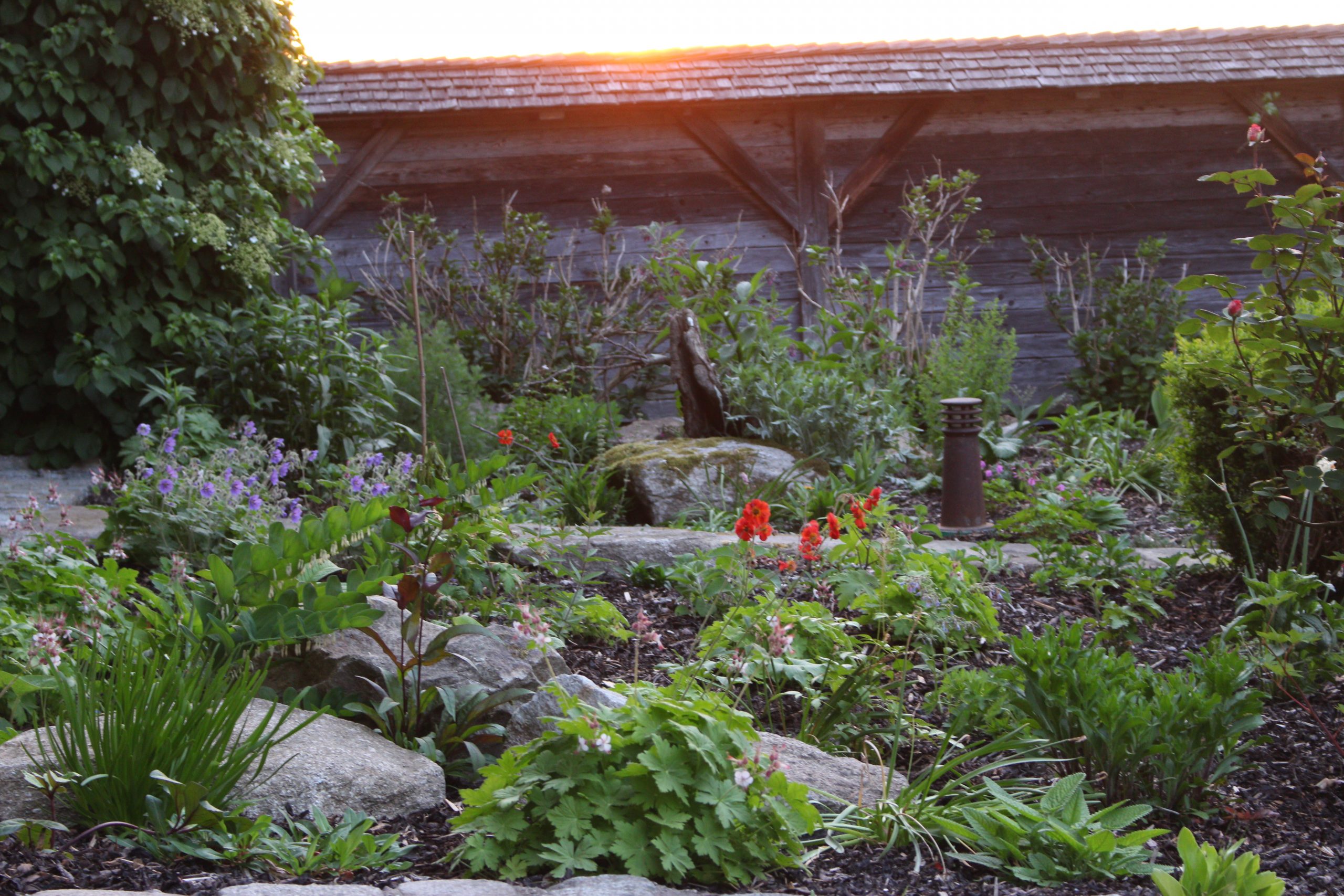 Die Errichtung eines Sitzplatzes an der Westseite des Hauses ermöglicht nun, die schöne Aussicht, welche die Lage bietet, mit einem Gläschen Wein zu genießen. Die Abendsonne wirkt besonders an diesem Platz und sehr viele Gräser (Miscanthus sinensis, Pennisetum alopecoroides, Imperata cylindrica, uvm.) glitzern in ihr.