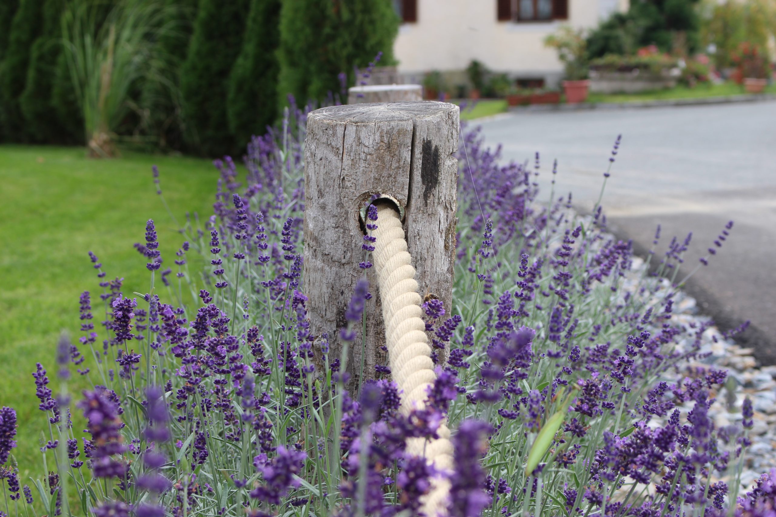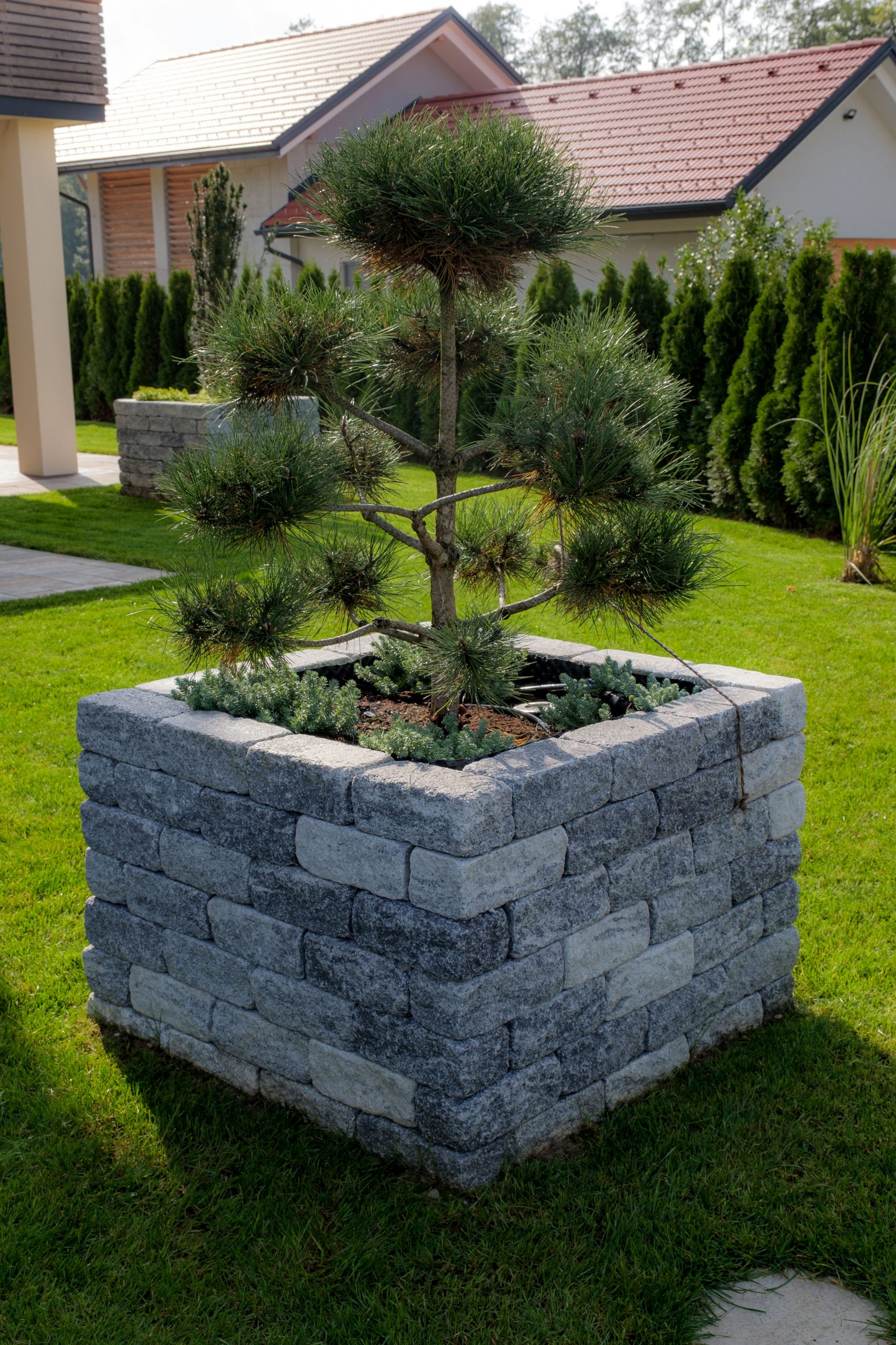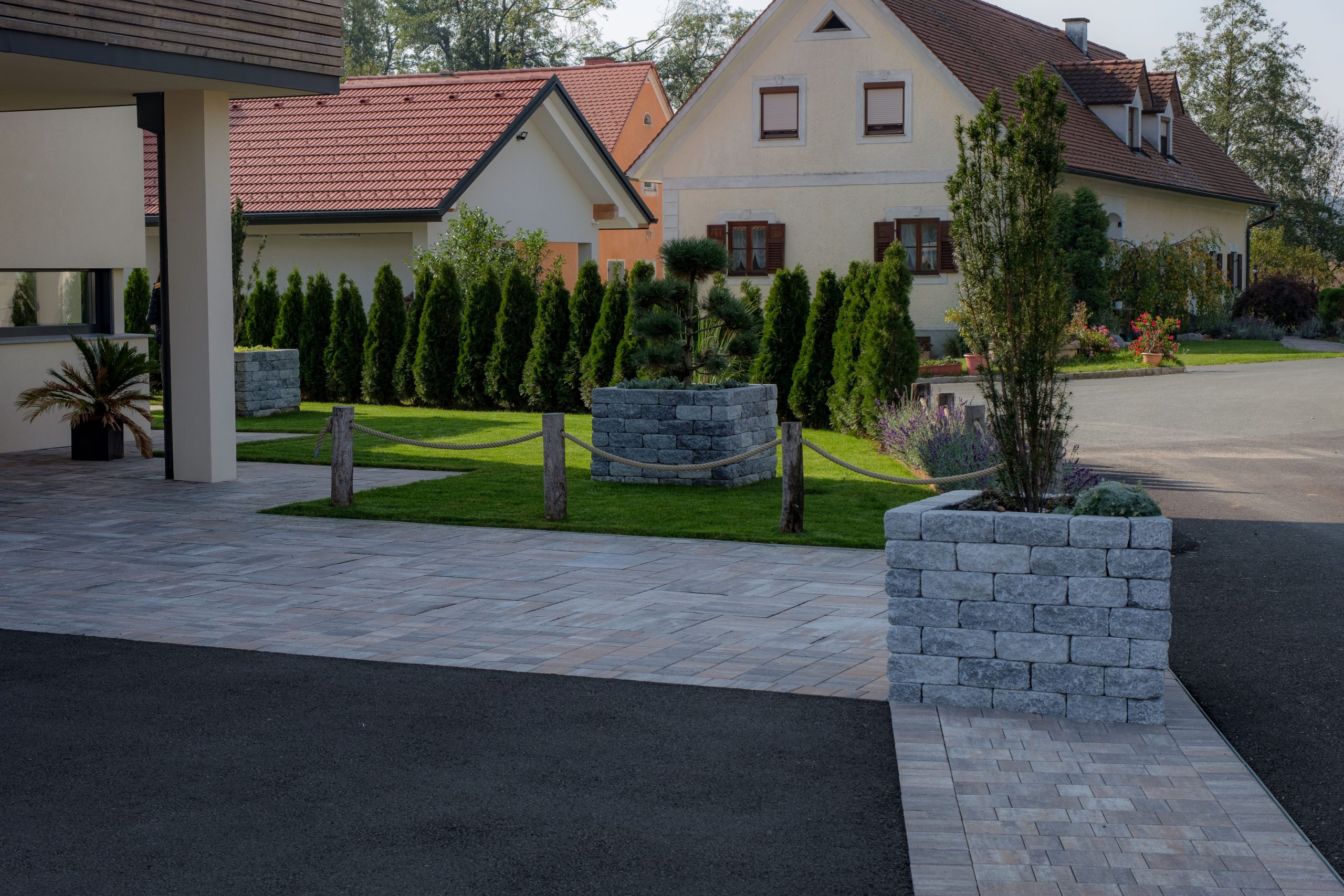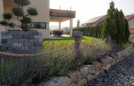 Lavendel im Eingangsbereich begrüßen nun jedem Besucher und beim Grillen sind mediterrane Kräuter sofort griffbereit! Die Pflasterung ist gezielt gewählt und erinnert an die Toskana, wo die Kunden es Lieben ihren Urlaub zu verbringen! In der Toskana schmücken Säulencypressen (Cypressus sempervirens ,Pyramentalis‘) die Landschaft. Diese funktionieren leider nicht im Süden Österreichs, deswegen haben wir als ähnliche Pflanzung uns für Säuleneiben (Taxus baccata ,Fastigiata‘) entschieden! Die Eibe ist in Österreich heimisch und trotzt dem Winter in dieser Region und bringt durch ihre Form ein wenig Toskana nach Österreich! Ein solitär gepflanzter Pinienbaum in Bon-Bon Form und Pampasgras machen den Mediterranen Garten nun komplett!