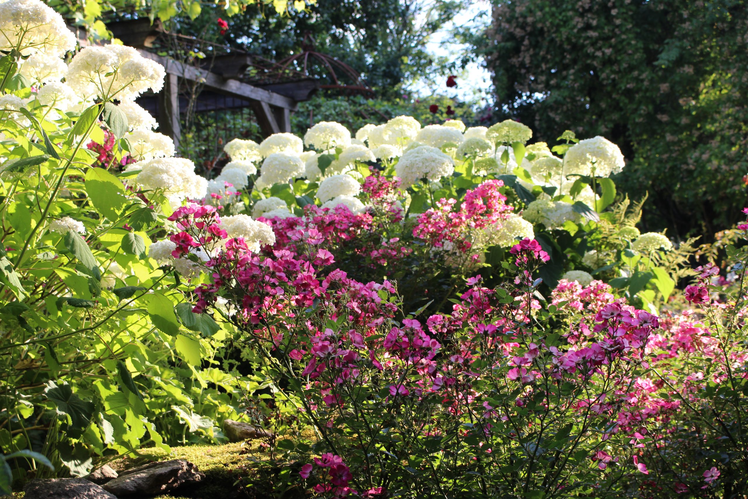 Die Blühfarben und der unterschiedliche Zeitpunkt der Blüte, sowie die warmen Herbstfärbungen der Sträucher und der Fruchtschmuck der Rosen, machen das Beet zu jeder Jahreszeit attraktiv!
