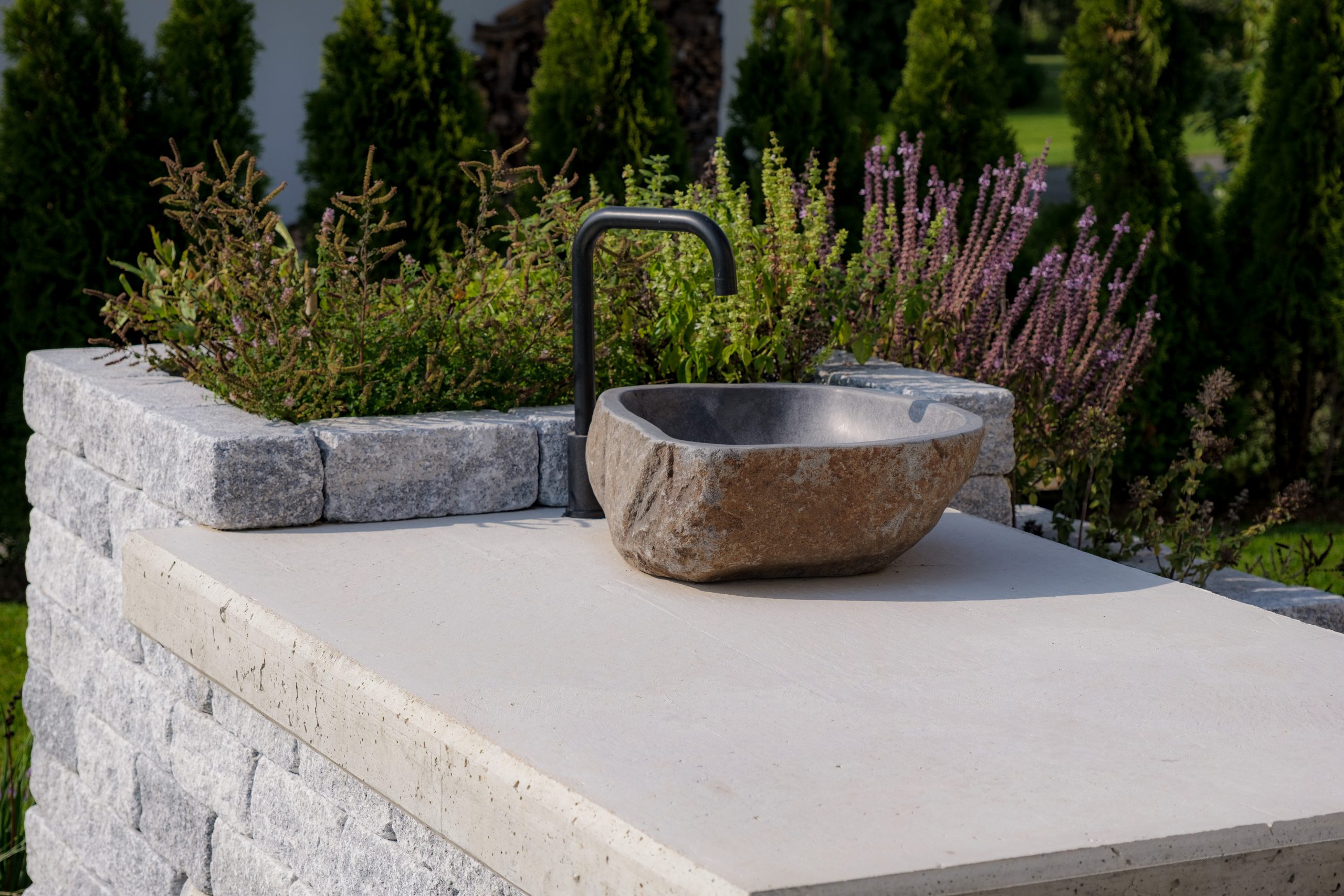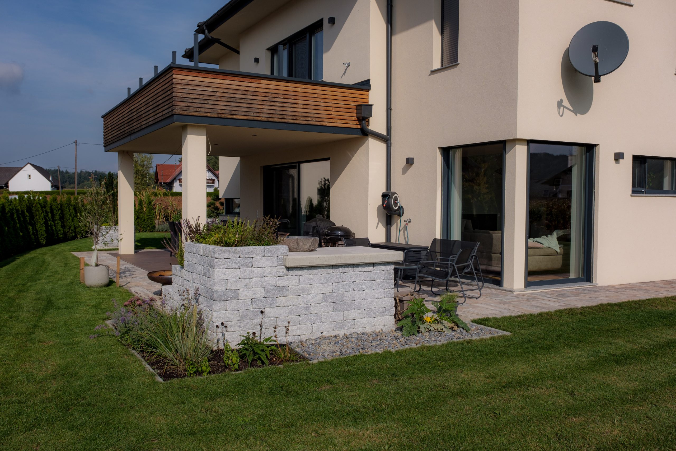 Wir wurden beauftragt mit der Planung des Eingangsbereichs und einer Outdoorkitchen im Süden Österreichs. Gemeinsam wurde viel philosophiert und nachgedacht, wie wir diesen Garten einem mediterranen Bungalow harmonisch integrieren! Die Kunden lieben es zu Grillen und haben einen Favor für den mediterranen Mittelmeerraum. Dies war ein entscheidender Einflussfaktor im Bau des Hauses und dann auch mit der Planung des Gartens!