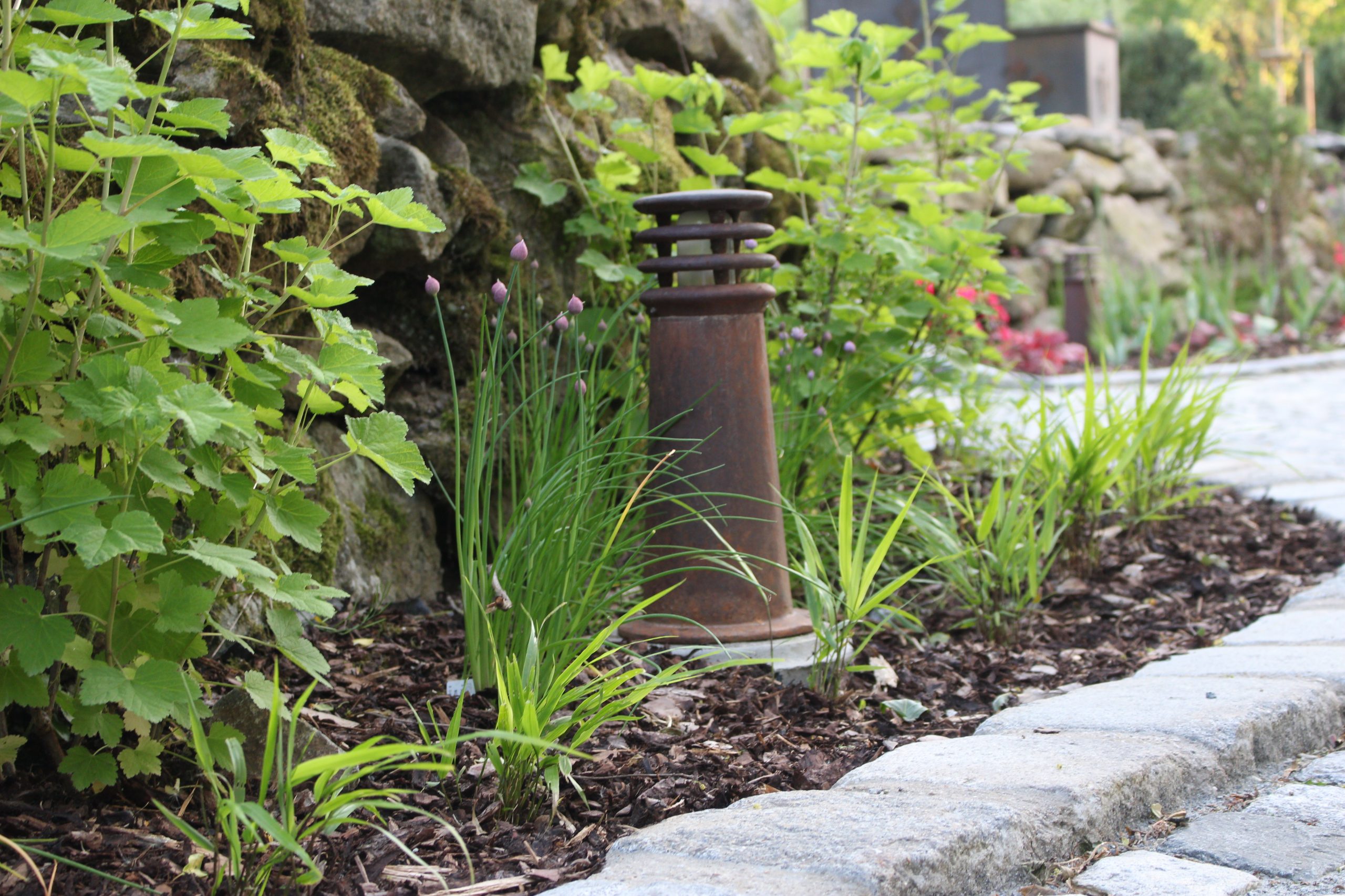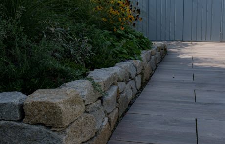 Durch das Aufbrechen der Hecke ist nun ein neuer Eingang entstanden, die Wegeführung führt direkt hin zur Holzterrasse und zur Pflasterfläche, wo hochkarätige Tischtennispartien nun stattfinden können! Die Pflasterung mit Graniteinfassung wurde aus wunderschönen Großfließenplatten mit Holzoptik von uns neu gemacht! Am Rand des Gartens legten wir Pflanzbeete an, welche mit einer Trockensteinmauer etwas höher herausragen. Die Höhenunterschiede lassen den kleinen Garten etwas größer wirken und die Bepflanzung macht ihn harmonisch und sehr präsentativ für die Kunden und deren Gäste! Der Einbau von Lichtspotts ermöglicht das auch zur Dämmerung und wenn es dunkel wird!