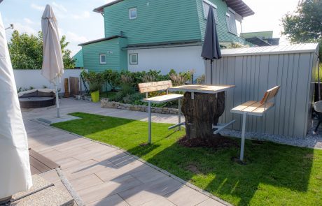 Es sollten neue Sitzgelegenheiten entstehen und sie liebten es Tischtennis zu spielen. Sie sind außerdem sehr gesellig und haben gerne Gäste bei sich eingeladen. Das heißt, der Garten soll auch eine angenehme Atomsphäre für kleine Feierlichkeiten und gemütliches Zusammensein haben. Mit diesen Wünschen haben wir dieses Konzept kreiert.
