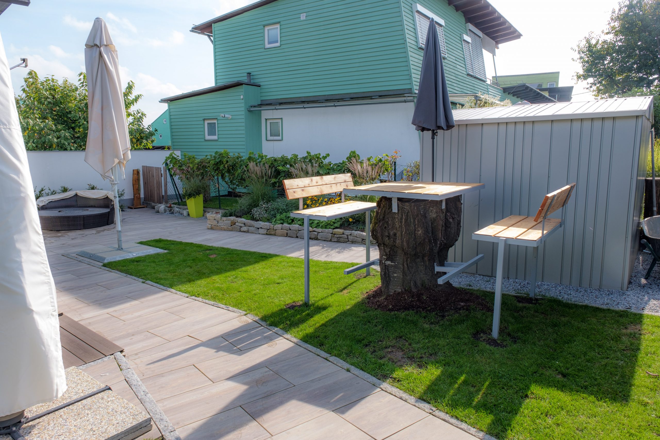 Damals dem Coronavirus geschuldet, haben diese Kunden plötzlich nicht mehr die Möglichkeit gehabt zu verreisen und verbrachten im Homeoffice sehr viel Zeit zu Hause. Da war es ein Segen, dass sie einen Garten besaßen! Bei einem großen Kirschbaum direkt neben dem Haus war Gefahr in Verzug und der musste weichen. Mit dieser Aktion war klar, dass sie im Zuge dessen gleich ihren Garten neugestalten möchten, und sie wanden sich an uns!